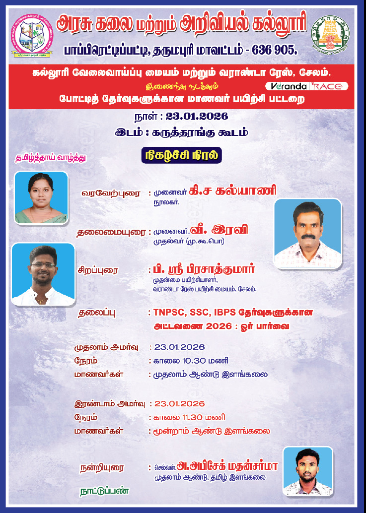 பாப்பிரெட்டிப்பட்டி, அரசு கலை மற்றும் அறிவியல் கல்லூரியில், 23.01.2026 வெள்ளிக்கிழமை அன்று, போட்டித் தேர்வுகளுக்கான மாணவர் விழிப்புணர்வு நிகழ்வு முதல்வர் முனைவர்.வீ. இரவி அவர்களின் தலைமையில் நடைபெற்றது. அவர் தம் தலைமையுரையில், "மத்திய மற்றும் மாநில அரசு துறைகளில் ஏராளமான வேலை வாய்ப்புகள் உள்ளன என்றும் மாணவர்கள் அதற்கான தேர்வுகளில் கவனம் செலுத்துமாறு" வலியுறுத்தினார். கல்லூரி வேலை வாய்ப்பு மையம் மற்றும் வராண்டா ரேஸ் சேலம் இணைந்து நடத்திய இந்நிகழ்வில், முதன்மை பயிற்சியாளர் திரு.பி.ஸ்ரீ.பிரசாத்குமார் அவர்கள், "TNPSC, SSC, IBPS தேர்வுகளுக்கான அட்டவணை 2026: ஓர் பார்வை" என்ற தலைப்பில் மாணவர்களிடம் உரை நிகழ்த்தினார். போட்டித் தேர்வுகளுக்கு தயாராகும் மாணவர்கள், கல்லூரி பயிலும் போதே அதற்கான பயிற்சிகளில், சரியான திட்டமிடலுடன் செயல்பட வேண்டும் என்றார். தேர்வுகளின் பாடத் திட்டங்களையும், வெற்றி பெறுவதற்கான வழிமுறைகளையும் மாணவர்களிடம் விளக்கமாக எடுத்துரைத்தார். தமிழ் இளங்கலை முதலாம் ஆண்டு மாணவர் அ.அபிசேக் மதன் சர்மா நன்றியுரை நல்கினார். நிகழ்விற்கான ஏற்பாடுகளை நூலகர்.கி.ச.கல்யாணி செய்திருந்தார்.