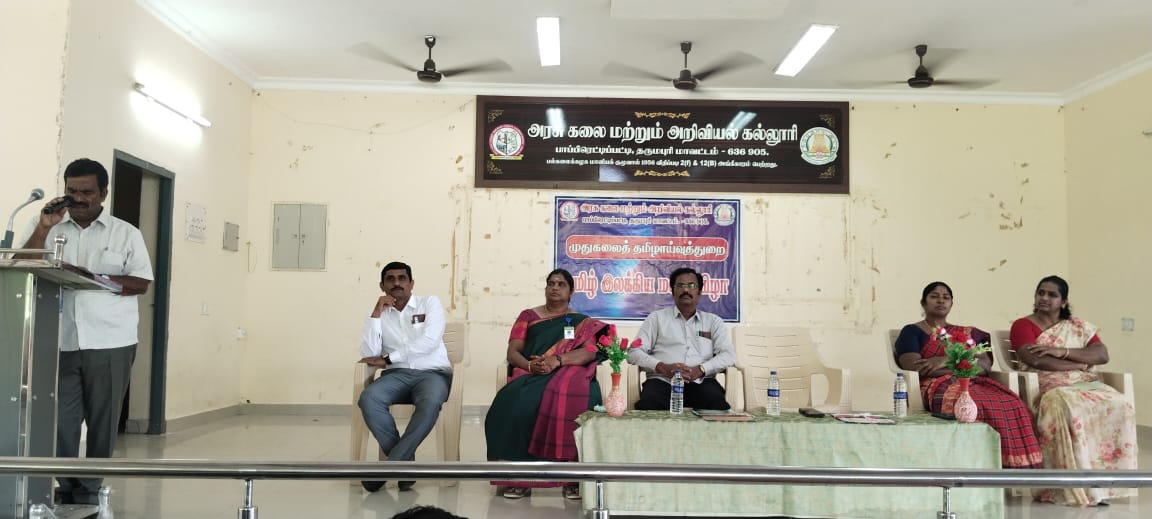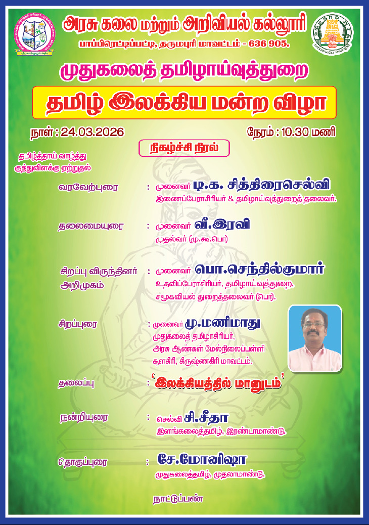 நமது கல்லூரியில் தமிழ்த்துறை சார்பாக 24.03.2026 அன்று தமிழ் இலக்கிய மன்ற விழா கல்லூரி முதல்வர் முனைவர் வீ.இரவி அவர்கள் தலைமையில் நடைபெற்றது. இவ்விழாவிற்கு முனைவர் மு.மணிமாது, முதுகலைத் தமிழாசிரியர் சூளகிரி, அரசு ஆண்கள் மேல்நிலைப்பள்ளி, அவர்கள் கலந்துகொண்டு சிறப்புரையாற்றினார். இந்நிகழ்வினை தமிழ்த்துறைத் தலைவர் முனைவர் டி.க.சித்திரை செல்வி அவர்கள் ஒருங்கிணைத்தார்.