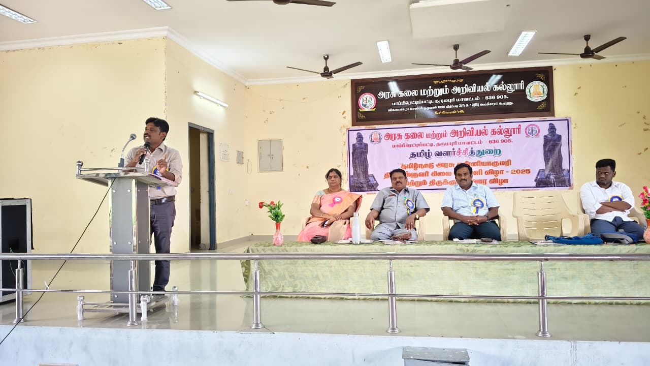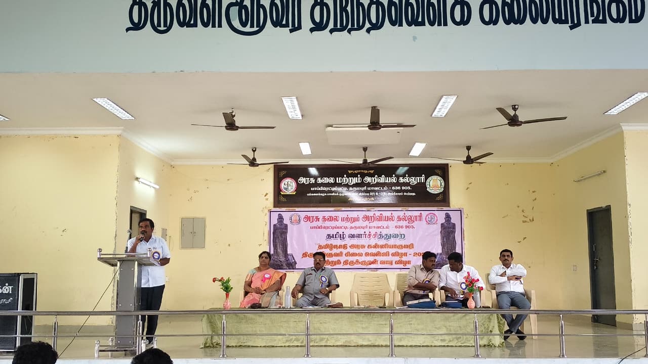 நமது கல்லூரியில் 07.01.2026-அன்று கன்னியாகுமரி திருவள்ளுவர் சிலை நிறுவிய வெள்ளி விழாவை முன்னிட்டு திருக்குறள் கருத்தரங்க முதல் நாள் தொடங்கப்பட்டது. இக்கருத்தரங்கத்திற்கு முதல்வர் முனைவர் வீ.இரவி அவர்கள் தலைமை தாங்கினார் அனைவரையும் தமிழ்துறை தலைவர் முனைவர் டி.க.சித்திரை செல்வி, அவர்கள் வரவேற்றார். முனைவர் பொ.செந்தில்குமார், தமிழ்த் துறை, உதவிப் பேராசிரியர் கருத்தரங்கத்தின் நோக்க உரை நிகழ்த்தினார். இக்கருத்தரங்கத்தின் சிறப்பு பொழிவாளர்களாக முனைவர் கு.கணேசன், சாகித்திய அகாதமி எழுத்தாளர் சேலம், முனைவர் சிவகாமி இணைப் பேராசிரியர் தமிழ்த்துறைத் தலைவர், அரசு கலை மற்றும் அறிவியல் கல்லூரி, முனைவர் பெ.சுரேஷ் உதவிப் பேராசிரியர் ஸ்ரீ வித்யா மந்தர் கலை மற்றும் அறிவியல் கல்லூரி ஊத்தங்கரை ஆகியோர் கலந்து கொண்டு சிறப்புரை ஆற்றினார்கள்.