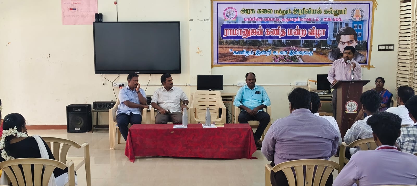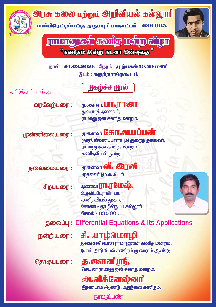 அரசு கலை மற்றும் அறிவியல் கல்லூரி பாப்பிரெட்டிப்பட்டி ராமானுஜன் கணித மன்றம், கணிதவியல் துறை சார்பாக மன்ற விழா கல்லூரியின் முதல்வர் முனைவர் வீ.இரவி அவர்களின் தலைமையில் (24.03.2026) அன்று நடைபெற்றது. இதில் சேலம் சோனா தொழில்நுட்பக் கல்லூரி கணிதவியல் துறை உதவி பேராசிரியர் முனைவர் ரா.ரமேஷ் அவர்கள் சிறப்பு விருந்தினராக கலந்து கொண்டு Differential Equations and It's Applications எனும் தலைப்பில் சிறப்புரையாற்றினார். இதில் கணிதத்துறை சார்ந்த மாணவ மாணவிகளும் கலந்து கொண்டனர்.