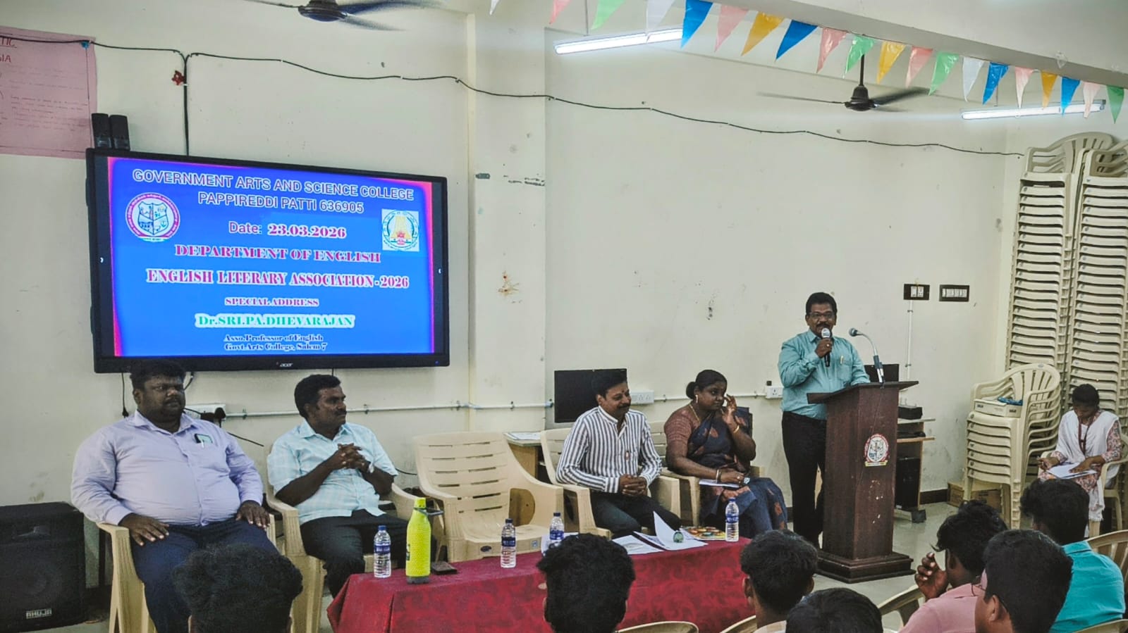 அரசு கலை மற்றும் அறிவியல் கல்லூரி, பாப்பிரெட்டிப்பட்டி ஆங்கில இலக்கிய மன்றம், ஆங்கிலத்துறை சார்பாக சிறப்பு இலக்கிய சொற்பொழிவு நிகழ்வு 23.03.2026 அன்று கல்லூரி முதல்வர் முனைவர் வீ.இரவி அவர்களின் தலைமையில் நடைபெற்றது. இதில் சேலம்-7 அரசு கலைக் கல்லூரி ஆங்கிலத்துறை பேராசிரியர் முனைவர் ஸ்ரீ.பா.தேவராஜன் அவர்கள் சிறப்பு விருந்தினராக கலந்து கொண்டு "Literature in Environment" என்ற தலைப்பில் சிறப்புரையாற்றினார் இந்நிகழ்வில் ஆங்கிலத்துறை மாணவ மாணவிகள் மற்றும் ஆசிரியர்கள் பங்கேற்றனர்.