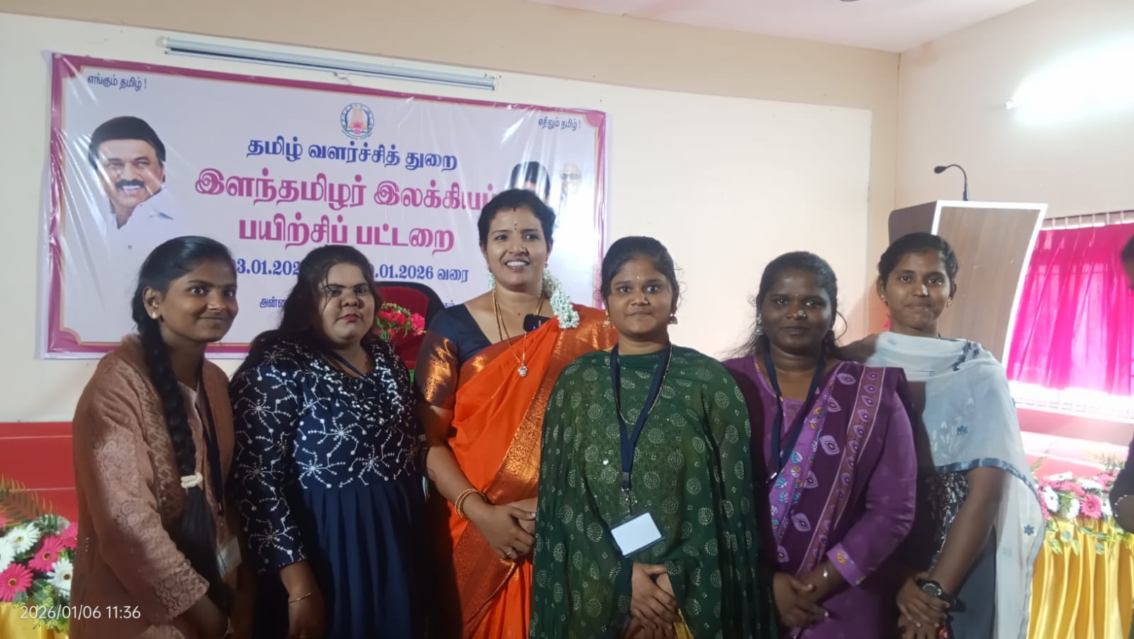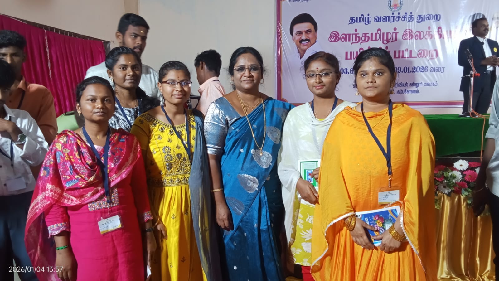 இளந்தமிழர் இலக்கியப் பயிற்சிப் பட்டறை கும்பகோணம் கோவிலாச்சேரியில் உள்ள அன்னை கலை மற்றும் அறிவியல் கல்லூரியில் தமிழ் வளர்ச்சித் துறை சார்பாக இளந்தமிழர் மாணவர் இலக்கியப் பயிற்சி பட்டறை 03.01.2026 முதல் 09.01.2026 வரை நடை பெற்றது. இப்பயிற்சி பட்டறையில் சே.மோனிஷா (முதுகலைத்தமிழ் முதலாம் ஆண்டு), சி.சீதா (இளங்கலைத் தமிழ் இரண்டாம் ஆண்டு) மாணவிகள் பங்கேற்றனர். அப்பயிற்சியில் 07.01.2026 அன்று நடைபெற்ற தமிழ் இலக்கிய விநாடி வினா போட்டியில் மூன்றாமிடமும்பரிசுத்தொகையாக ரூ.2000/-த்தையும் பெற்று கல்லூரிக்கும் தமிழ்த்துறைக்கும் பெருமை சேர்த்தார்.