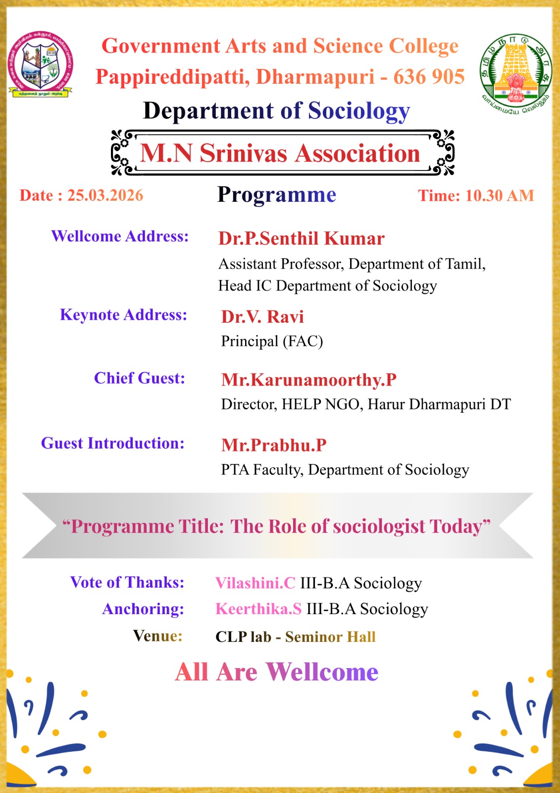நமது கல்லூரியில் இன்று 25.03.2026 சமூகவியல் துறை M.N.ஸ்ரீனிவாஸ் மன்ற விழா முதல்வர் முனைவர் வீ.இரவி தலைமையில் நடைபெற்றது. இவ்விழாவில் தருமபுரி மாவட்ட HELP NGO இயக்குனர் திரு பி.கருணா மூர்த்தி அவர்கள் கலந்துகொண்டு சிறப்புரையாற்றினார். இந்நிகழ்வில் சமூகவியல் துறை தலைவர் (பொ) முனைவர் பொ.செந்தில்குமார் பெற்றோர் ஆசிரியர் கழக ஆசிரியர்கள் திரு இளஞ்செழியன் பிரபு ஆகியோர் கலந்து கொண்டனர்.