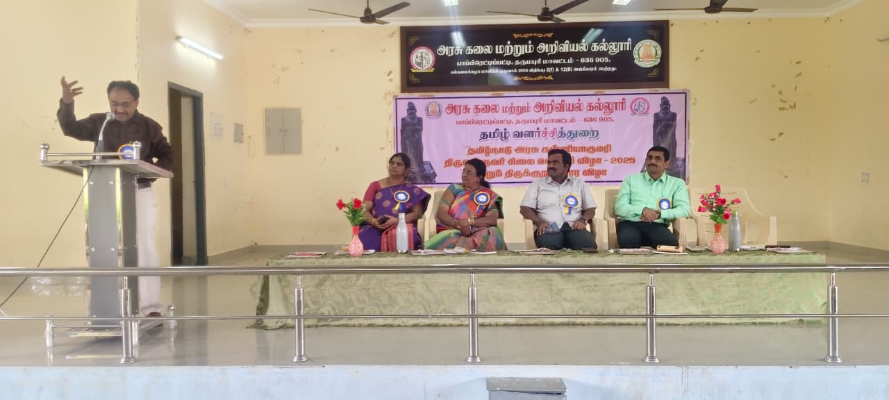 நமது கல்லூரியில் 07.01.2026-அன்று கன்னியாகுமரி திருவள்ளுவர் சிலை நிறுவிய வெள்ளி விழாவை முன்னிட்டு திருக்குறள் கருத்தரங்க முதல் நாள் தொடங்கப்பட்டது. இக்கருத்தரங்கத்திற்கு முதல்வர் முனைவர் வீ.இரவி அவர்கள் தலைமை தாங்கினார் அனைவரையும் தமிழ்துறை தலைவர் முனைவர் டி.க.சித்திரை செல்வி, அவர்கள் வரவேற்றார். முனைவர் பொ.செந்தில்குமார், தமிழ்த் துறை, உதவிப் பேராசிரியர் கருத்தரங்கத்தின் நோக்க உரை நிகழ்த்தினார். இக்கருத்தரங்கத்தின் சிறப்பு பொழிவாளர்களாக முனைவர் கு.கணேசன், சாகித்திய அகாதமி எழுத்தாளர் சேலம், முனைவர் சிவகாமி இணைப் பேராசிரியர் தமிழ்த்துறைத் தலைவர், அரசு கலை மற்றும் அறிவியல் கல்லூரி, முனைவர் பெ.சுரேஷ் உதவிப் பேராசிரியர் ஸ்ரீ வித்யா மந்தர் கலை மற்றும் அறிவியல் கல்லூரி ஊத்தங்கரை ஆகியோர் கலந்து கொண்டு சிறப்புரை ஆற்றினார்கள்.