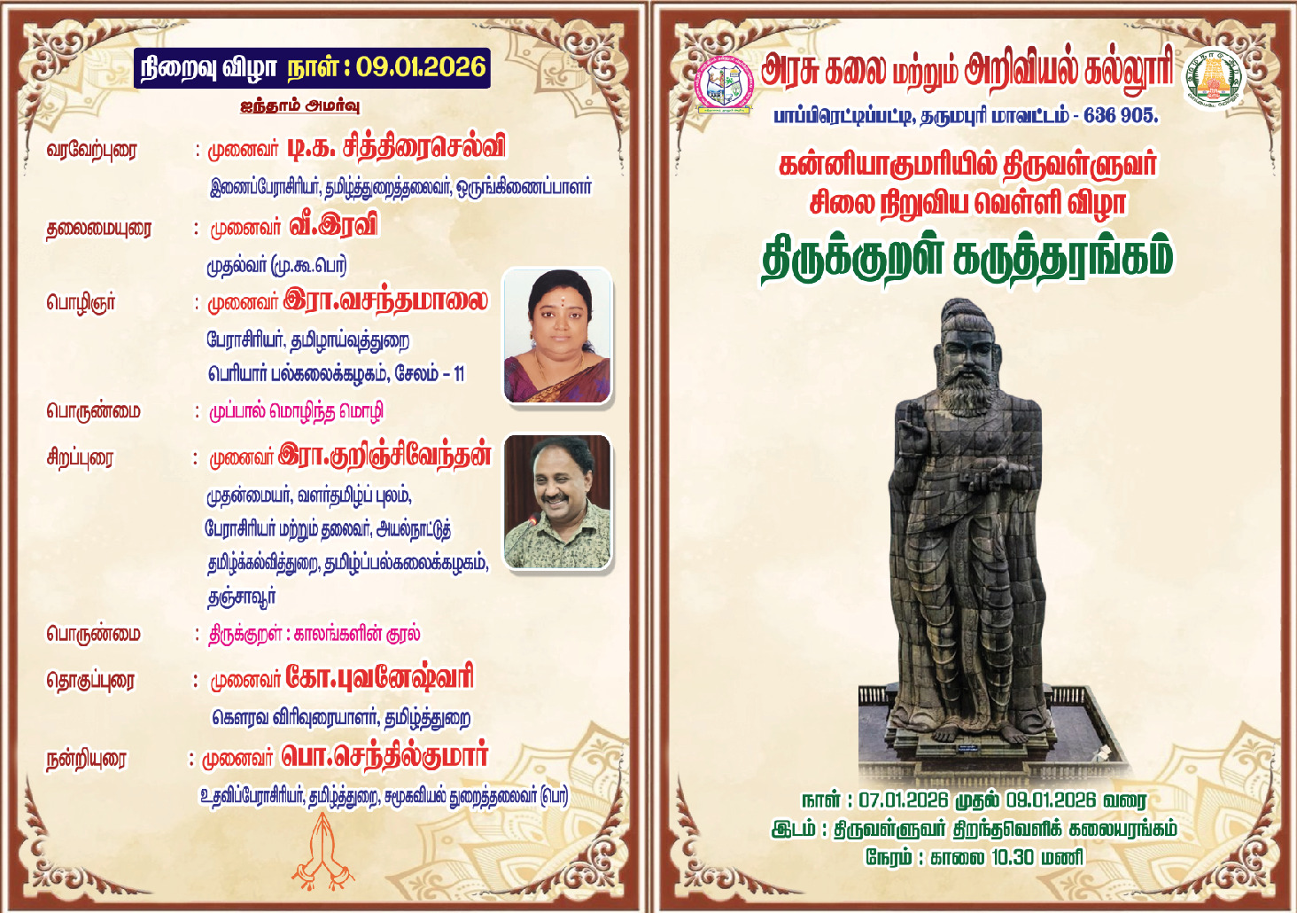 திருக்குறள் கருத்தரங்கத்தின் மூன்றாம் நாள் 09.01.2026 நிகழ்வில் சிறப்பு பொழிஞர்களாக தஞ்சைத் தமிழ்ப் பல்கலைக்கழக அயல்நாட்டு மொழிகள் துறைத்தலைவர், புல முதன்மையர், வளர்தமிழ் புலம் முனைவர் குறிஞ்சி வேந்தன், பெரியார் பல்கலைக்கழக தமிழ்த்துறை பேராசிரியர் முனைவர் இரா.வசந்தமாலை அவர்கள் கலந்துகொண்டு சிறப்புரையாற்றினார்கள், திருக்குறள் போட்டியில் கலந்து கொண்ட மாணவர்களுக்கு ரூபாய் 31 ஆயிரத்து 500 பரிசு வழங்கி பாராட்டி சான்றிதழ் கொடுக்கப்பட்டது.