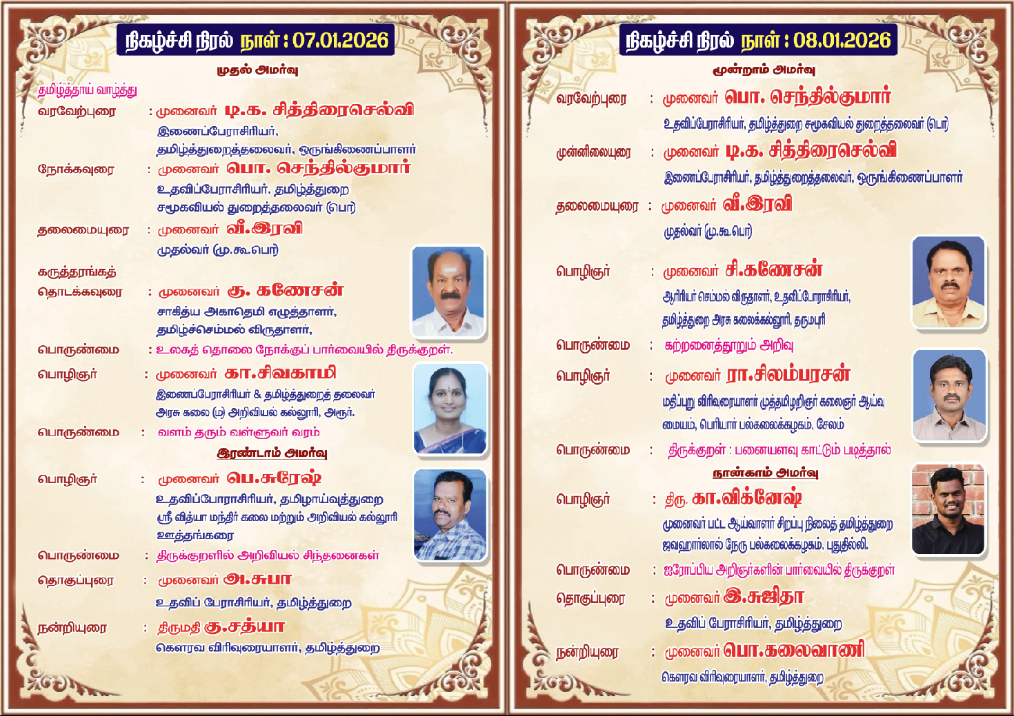 திருக்குறள் கருத்தரங்கத்தின் இரண்டாம் நாள் 08.01.2026 அமர்வில் சிறப்பு பொழிஞர்களாக முனைவர் சி.கணேசன், தமிழ்த்துறை உதவிப் பேராசிரியர், அரசு கலை மற்றும் அறிவியல் கல்லூரி தருமபுரி, முனைவர் ரா.சிலம்பரசன் மதிப்புறு விரிவுரையாளர், முத்தமிழ் அறிஞர் கலைஞர் ஆய்வு மையம், பெரியார் பல்கலைக்கழகம் சேலம் திரு.கி.விக்னேஷ் முனைவர் பட்ட ஆய்வாளர், ஜவஹர்லால் நேரு பல்கலைக்கழகம், புதுடெல்லி ஆகிய மூவரும் சிறப்புரை நிகழ்த்தினார்கள்.